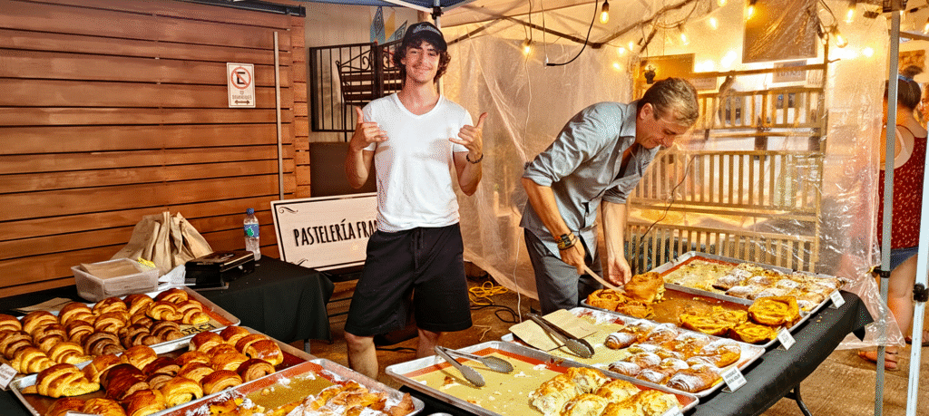 Food stalls sent aromatic clouds drifting through the warm evening air. The scents mingled and intertwined—grilling meat, fresh herbs, baking bread, tropical fruits, exotic spices. Vendors offered everything from traditional Costa Rican dishes to international fusion cuisine. Baked goods were piled high—empanadas, pastries, breads, cookies. The homemade quality of everything was evident; these weren’t mass-produced items but labor-intensive creations made with pride and skill.